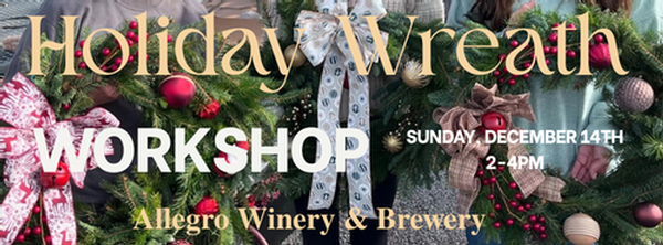 Celebrate the holidays by making your own beautiful, festive 18” wreath (approximately 22" finished size). Lori from Brown's Orchard and Farm Market will walk you through building the wreath with fresh greens & then you can get creative by adding ornaments, picks and a bow. All supplies & materials included. Enjoy a complimentary glass of wine or a draft beer, or our special Jingle Juice wine cocktail while you get crafty. You must be 21 years of age or older to attend this event.